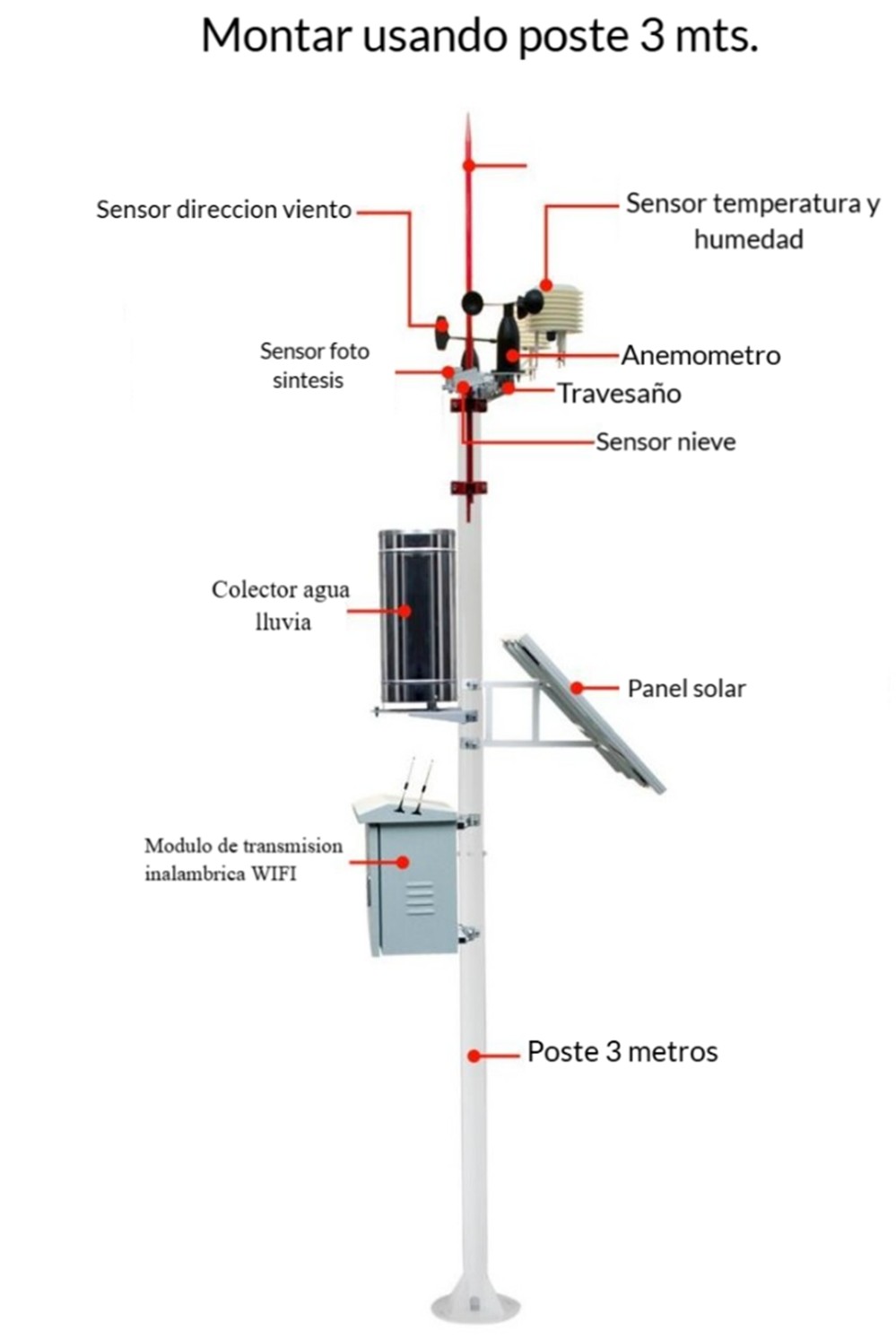Este producto es un sistema integral de recopilación, almacenamiento, transmisión y gestión de datos meteorológicos. Desarrollado y fabricado de acuerdo con las normas meteorológicas internacionales de la OMM, permite monitorizar simultáneamente la temperatura atmosférica, la humedad atmosférica, temperatura y, la precipitación.  Ofrece visualización y carga en tiempo real, posicionamiento cartográfico, generación automática de tablas de Excel con datos históricos, comunicación de datos, etc. Este producto consta de 3 partes: sensor meteorológico, colector de datos meteorológicos y software meteorológico. El sistema adopta un diseño modular que permite aumentar o reducir con los módulos y sensores según las necesidades de los usuarios y puede combinarse a voluntad para satisfacer las necesidades de diversos usuarios de forma fácil y rápida. Cuenta con las ventajas de tecnología avanzada, alta precisión de medición, gran capacidad de datos, larga distancia de telemetría, interfaz hombre-máquina intuitiva y alta fiabilidad. Se utiliza ampliamente entre otros, en campos de la meteorología, agricultura, oceanografía, medio ambiente, aeropuertos, puertos, la industria, la agricultura y el transporte.
